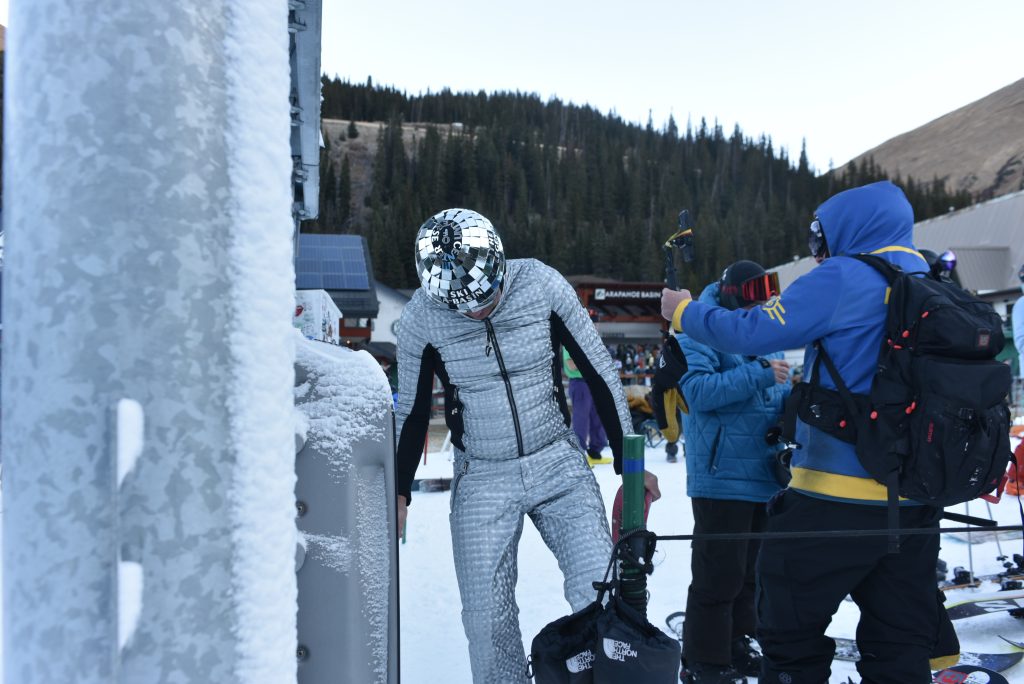 People couldn’t miss the first chair crew if they tried thanks to skier Darren Droge’s, or “Disco Darren,” custom disco-ball inspired helmet engraved with sayings like “The Legend,” a reference to the colloquial slogan for the resort, and his silver ski outfit. Next to him, wearing an eye-catching royal blue outfit, was Tom Miller, or “Trailer Tom.” Miller sported “33” on his outfit to represent what he said is a 33-year streak of being first chair at Arapahoe Basin. Droge said he holds a 33-year streak for second chair. The pair also got their first gondola at Keystone Resort’s opening day Saturday, Oct. 25.