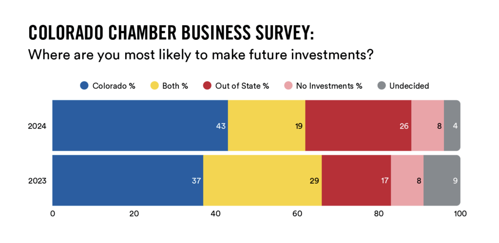 “We now have 34% (of businesses) indicating they are not likely to make investments in Colorado — this is up from 25% last year. Among those already working in other states, this hits 41%,” Colorado Chamber Pollster Pat McFerron wrote in the report.