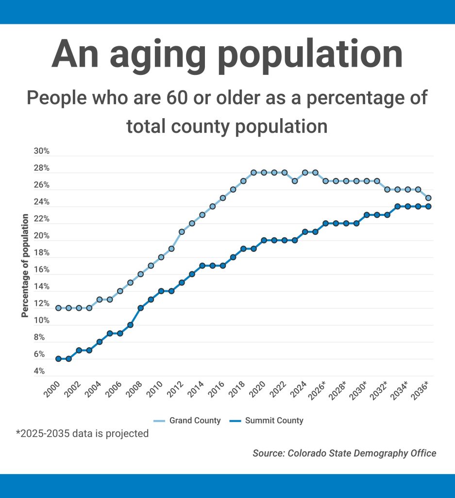 According to data from the Colorado State Demography Office, Grand and Summit’s 60-plus populations accounted for 12% and 6% of the counties’ total populations, respectively, in 2000. By 2010, those figures were 18% and 14%. The number of adults 60 or older in Grand saw a 75% increase over that time period, and Summit’s saw a 162% increase. The total population in both counties over the same period increased 15%. Today, Grand County’s 60-plus population accounts for 27% of the total population and Summit County’s accounts for 22%, according to demography office projections for 2026.