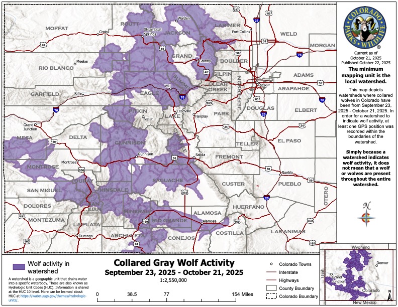 Colorado Parks and Wildlife’s latest wolf map — which highlights watershed activity from the state’s collared gray wolves between Sept. 23 and Oct. 21 — shows a broad trend of southward migration, with wolf activity recorded in several counties across southwestern Colorado including southern Mesa County, Chaffee, Montrose, San Miguel, Ouray and others. Wolves also remained active in Gunnison, Saguache, Mineral and Rio Grande counties from September into October.