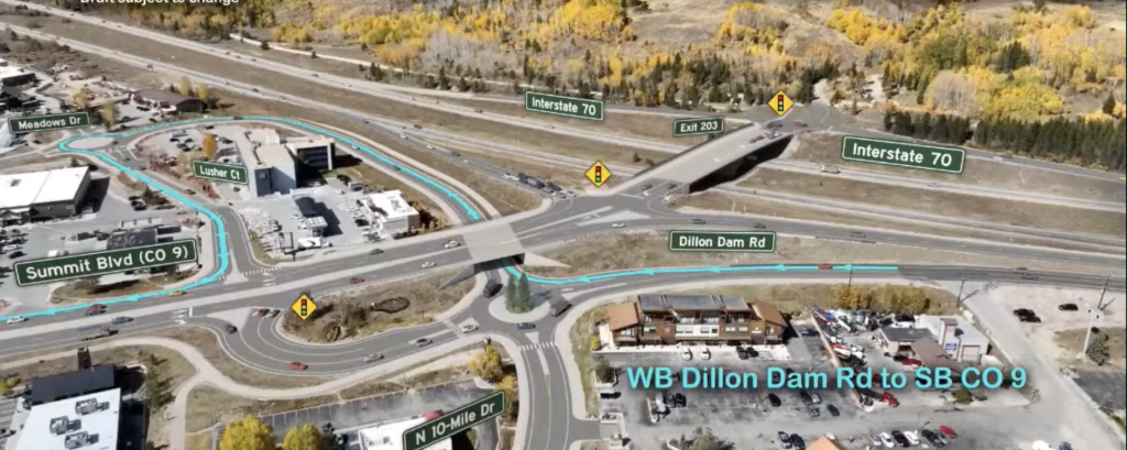 The Exit 203 interchange has long been identified as a chokepoint in Summit County’s transportation network, particularly during peak travel seasons when a larger volume of interstate traffic converges with local travel along Highway 9. The heavy traffic and congestion — driven both by daily commuters and vacationers heading to ski resort and recreation areas — frequently lead to back-ups on exit ramps and create safety concerns for drivers, cyclists and pedestrians.