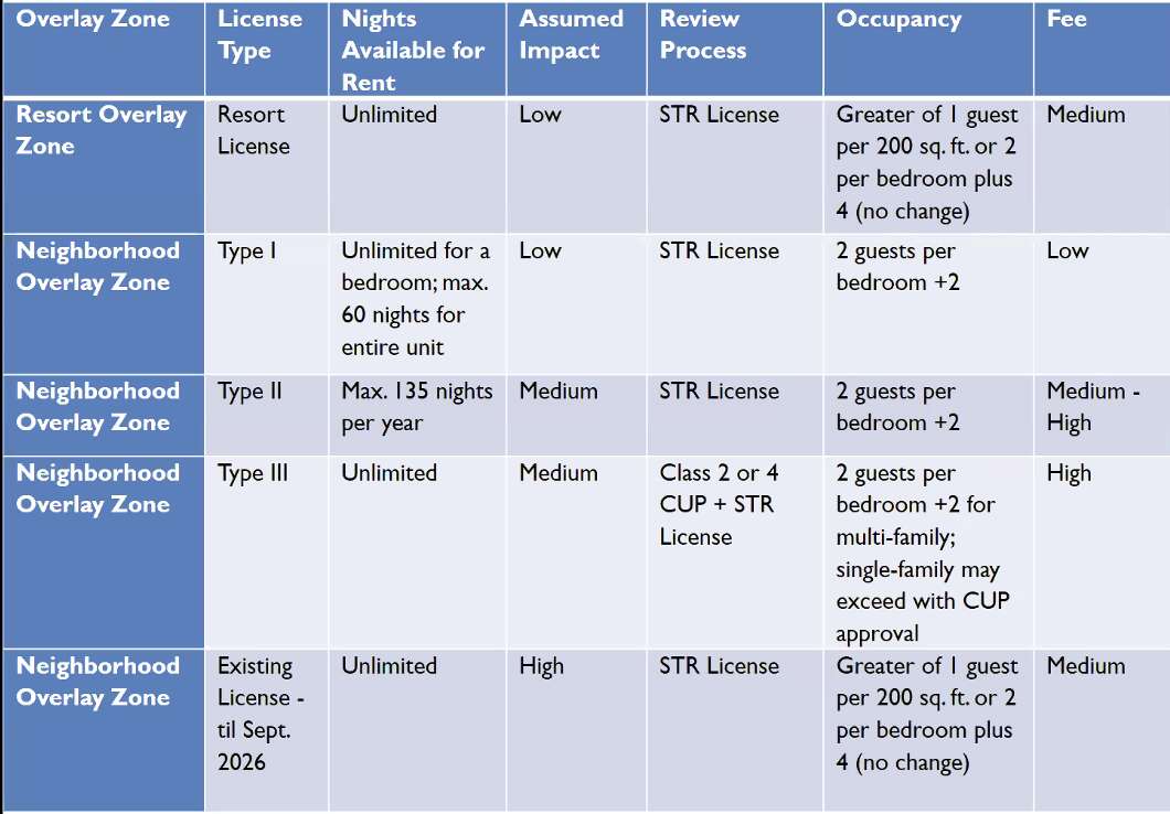 Neighborhood zones will have three types of licenses depending on the type and use of the home: