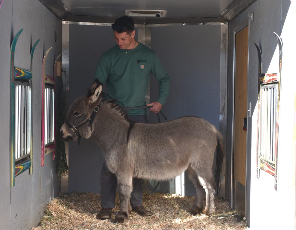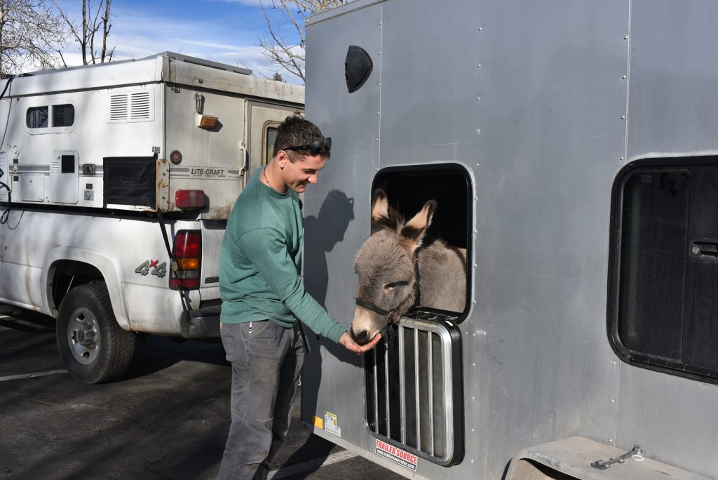 His bond to Donkey began when he moved to Colorado to work on a farm on the Front Range, where Donkey lived, around three years ago. Jordan said it didn’t take long for him to notice the inconsistent care the farm was giving Donkey. He said he was not being fed regularly, and his pen was not being cleaned out regularly, either. He began spending time with Donkey and wondered what he could do to help him feel better. He thought about how beneficial walks are for dogs, so he thought he’d give that a try.
