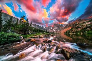 Tired legs didn’t seem to matter anymore as he began running to position himself at the front of the beautiful Lake Isabelle. He waded in knee deep and carefully staged his tripod in the middle of the stream flowing from the lake, just on top of a nearly 100 foot waterfall, and asked his camera battery for one small moment of cooperation. The sunset to follow was incredible. The camera battery managed to work for just long enough to capture what Angiono describes as “the most incredible sunset I have ever seen.”