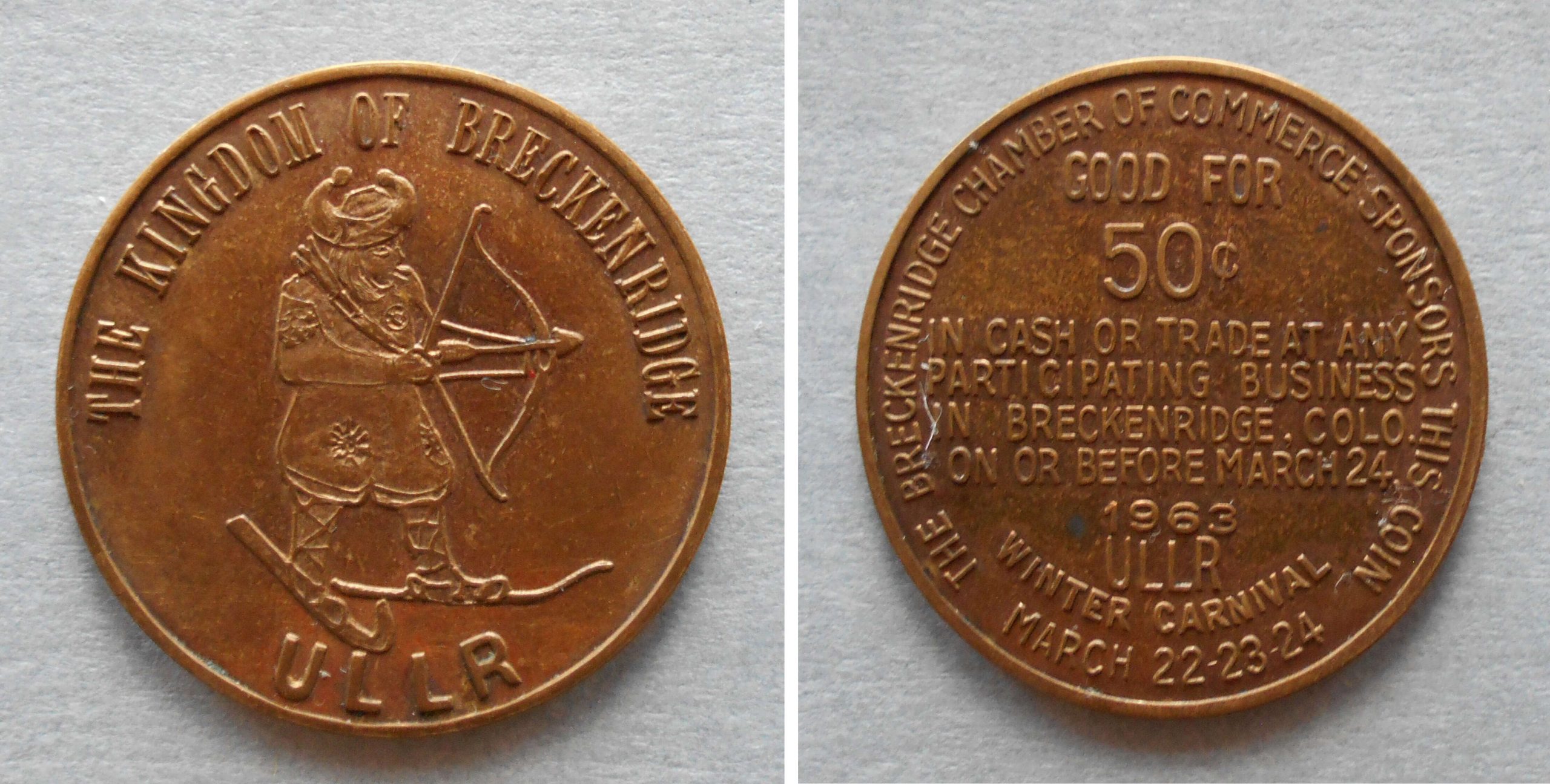 Intrigue between rival ski areas surfaced with the saga of the Ullr coins, and someone reported Breckenridge to the U.S. treasury. Coin souvenirs, along the lines of Ullr talismans, were common swag at Colorado events. Robert Theobald, attorney for the event, reminded treasury officials that many other places issued these coins and that “there had been no holler at all.” Treasury officials admitted the law was rarely enforced, but someone registered a protest.