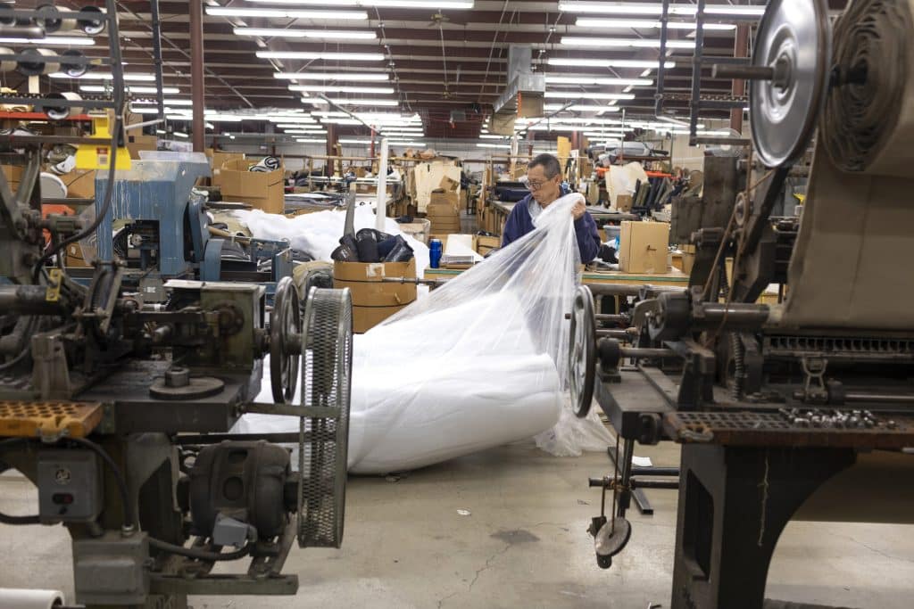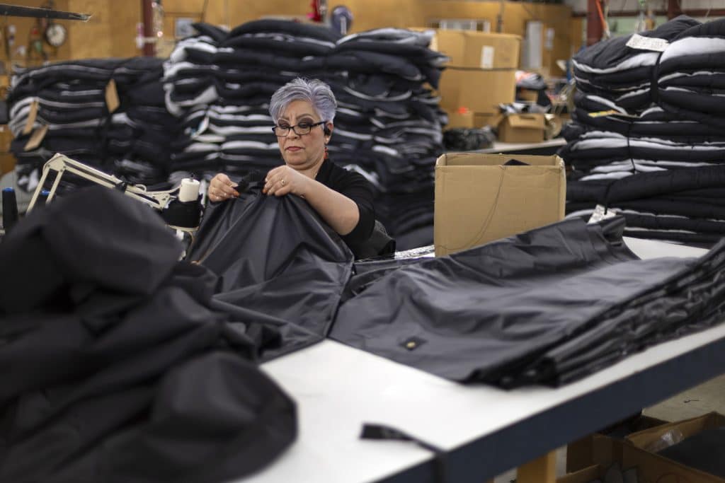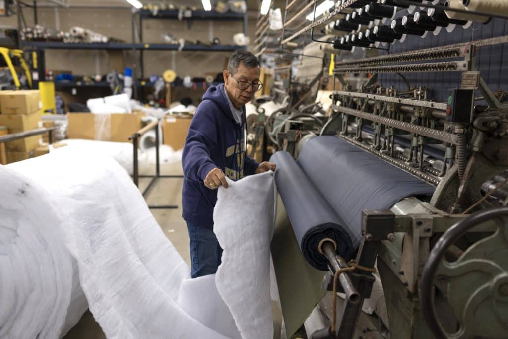 The same machines — and a lot of the same workers — make bags the exact same way today. He started making insulating jackets and vests several years ago but stopped in 2019 as he struggled to hire enough workers.