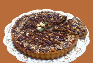 Cool, decorate (optional), and chill the tart: Remove the baked tart to a rack. Cool it completely and, if desired, drizzle lines of dark chocolate across the top, rim it with a circle of chopped nuts and place whole nuts in the center. Refrigerate it in the pan, covered, for at least three hours or overnight.