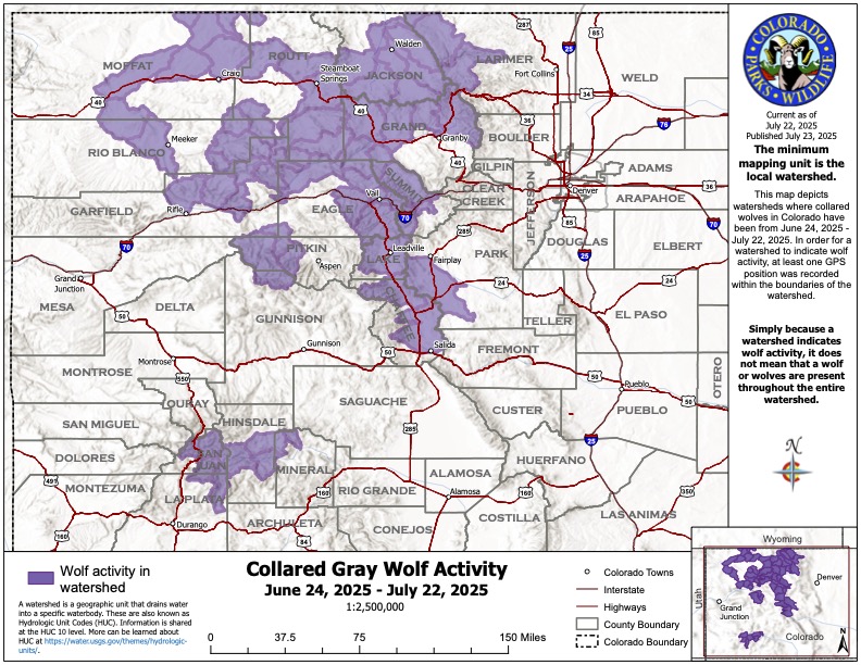 Aug. 16, 2025: A male uncollared wolf that was chronically depredating in Rio Blanco County was shot, but officials could not confirm if the animal died.